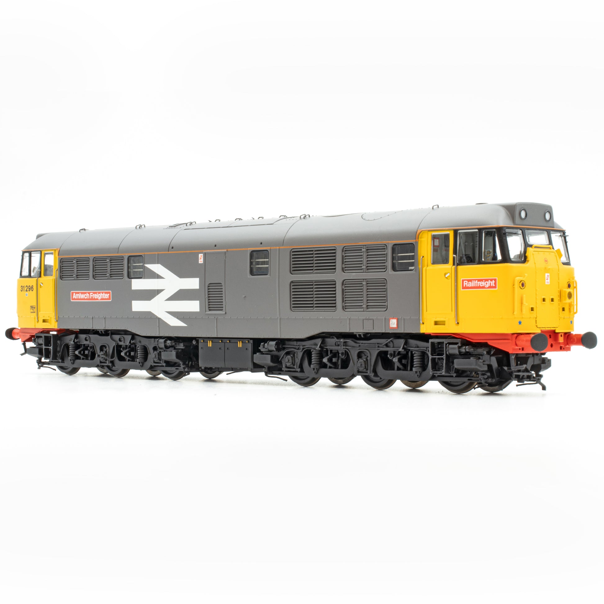 31296 Amlwch Frachter / Trên Nwyddau Amlwch Güterbahn (orangefarbener Dachstreifen)In der ersten Septemberwoche 1986 wurde der kürzlich überholte 31296 aus der Anonymität hervorgehoben für das, was damals als „doppeltes Novum“ bezeichnet wurde. Nach Anglesey in Nordwales entsandt, wurde die Lokomotive mit Cricklewood-Zulassung die erste der Baureihe 31 (und Typ 1 oder Typ 2), die einen Namen erhielt, sowie die erste, die zweisprachige walisische und englische Namensschilder trug, mit Amlwch Frachter und Trên Nwyddau Amlwch auf gegenüberliegenden Seiten des Körpers. Dieses Ereignis würdigte die vier Jahrzehnte währende Partnerschaft zwischen British Rail und Associated Octel sowie 33 Jahre Schienenlieferungen vom Werk Anglesey, damals der weltweit größte Hersteller von flüssigem Brom. Dies war die letzte Lockerung der restriktiven Benennungsregeln von BR, die im Laufe des vorangegangenen Jahrzehnts allmählich aufgeweicht worden waren. Unser Modell trägt die spätere Standardlackierung der Güterbahn in Grau mit orangefarbenem Dachstreifen und ist mit geätzten Metallnamensschildern sowie einem Paar der markanten sechseckigen Octel-Kopftafeln ausgestattet, die diese Brush-Maschine an ihrem großen Tag trug. Im Mai 1987 wurde sie nach Bescot und im Januar 1989 nach Stratford umgegliedert, wo sie in dieser Zeit häufig im Personenverkehr in den Midlands und im Nordwesten – und sogar bis nach Devon im Süden – eingesetzt wurde, neben ihren regelmäßigen Güterdiensten. Gegen Ende desselben Jahres wurde sie in dreifachem Grau mit Bauwerksbeschriftungen umlackiert und behielt zunächst ihre Namensschilder. Diese wurden im März 1990 entfernt und an Railfreight Distribution zurückgegeben, wo sie an Tinsleys 47330 wieder angebracht wurden. Die ehemalige D5829 wurde im März 1993 aus dem Dieselwerk Crewe ausgemustert, überlebte jedoch irgendwie im Bestand von EWS. Schließlich wurde sie im Januar 2004 auf dem Gelände der LNWR verschrottet.